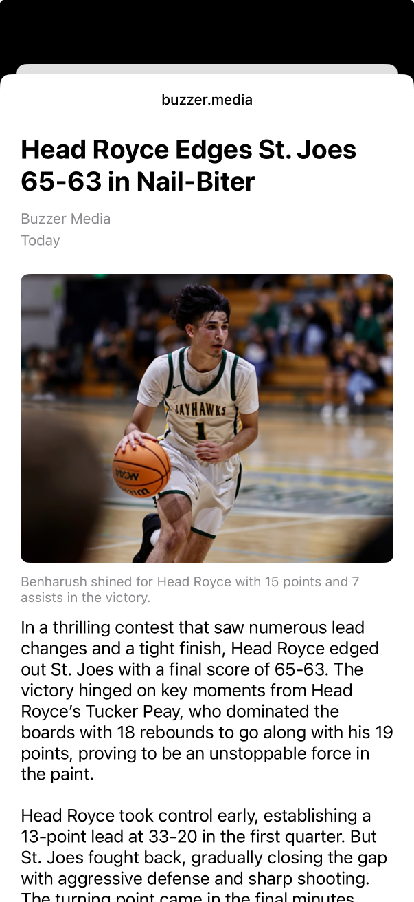 After every game, Buzzer's AI writes a full newspaper-style article – complete with headlines, key plays, top performers, and momentum shifts. Share it with your team, post it on social, or save it for the memories.