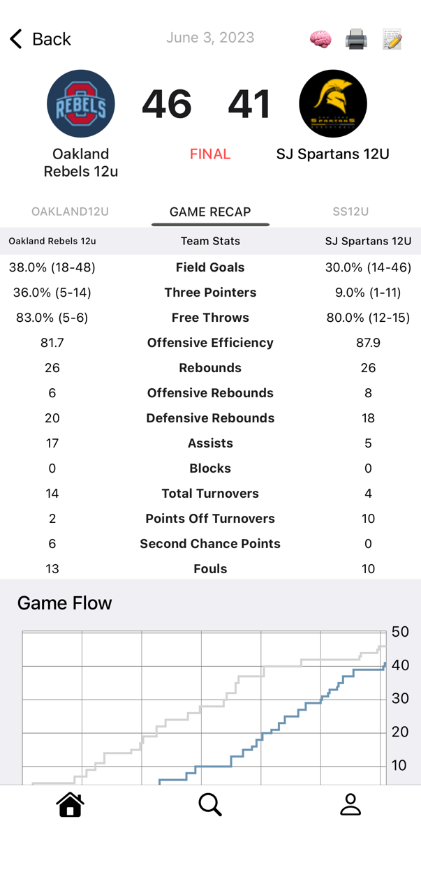 Watch the game unfold in real-time with live score tracking, detailed play-by-play logs, and dynamic game flow charts. See momentum shifts, key plays, and scoring runs as they happen – all updated instantly from the scorer's phone.